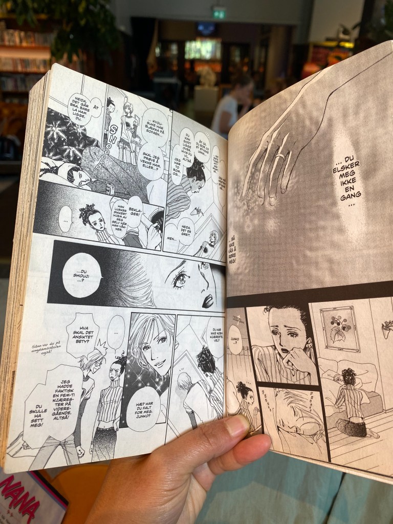 翻開第一集,嗯,是挪威文!圖書館有21集,他們是挪威文版本的NANA,這麼小眾的市場,一個只有五百多萬人講的語言,竟然有這個市場擁有挪威文的NANA?