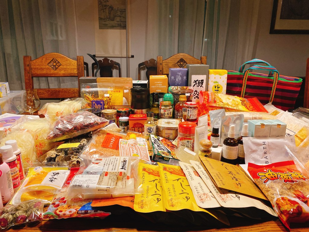 今年二月中從台北飛去東京,兩個城市都買滿買好,SKII大罐的青春露們,大容量的小棕瓶們,精油化妝水,半年份的日拋隱形眼鏡,茅乃舍的各種高湯底包,米粉冬粉雞絲麵,乾的金針菇木耳,吃的辣油柚子胡椒調味料們,油蔥酥,熬湯的昆布小魚乾,市場的手工麵線,郭元益的蛋黃酥,柚子酒跟清酒們,回去之後馬上會用到的就先買,反正到時要補貨還可以用EMS寄來。