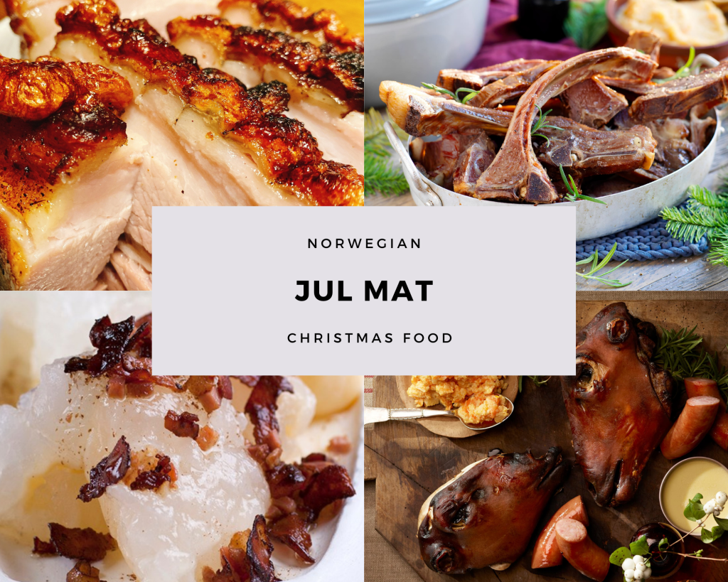 挪威人的聖誕節晚餐每個地區吃的都不大一樣。在聖誕節時間才會出現的特別食物有好幾種。Lutefisk,是一種用鱈魚跟鹼液做成的魚,古老時候因為魚類保存不易留下來的醃製方法,雖然是鱈魚但質感是半透明的,我覺得根本沒有味道,吃的時候會配上很多配菜跟奶油醬料。我只有在去朋友家作客的時候吃過一次 ,口感一言難盡。Pinnekjøtt是鹽醃製跟煙燻的羊肋排,基本上是用蒸的方式來準備,在蒸之前要泡在水裡很多天去除鹽分,我開始吃羊肉之後有時候我們會弄來吃,因為要花很多時間吃到的肉又很少,我們吃的頻率是比較低的。Ribbe就是我們一年到頭都在吃的脆皮燒肉,這也是我最喜歡的挪威食物,其實是因為它就是很像亞洲菜吧,根本就是港式脆皮燒肉啊。挪威有些地區會吃Smalahav,就是很嚇人的切一半的羊頭放在餐盤上面,說到底羊頭有什麼地方是有肉可以吃的呢?羊他們的臉頰都超瘦的耶。
