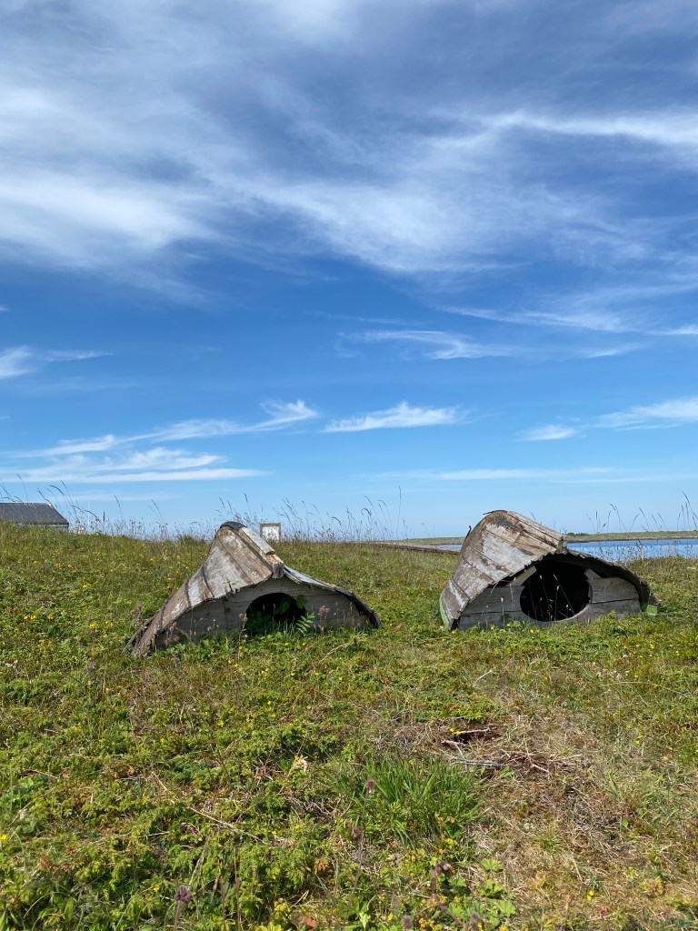 看了兩個短片跟參觀了小小的展區之後,我就走棧道去海邊散步。一走下棧道馬上就看見好幾隻山羊躲在遺產中心的地板下遮陽,這一天太陽非常的大,天氣很熱,連出門吃草的羊兒們都覺得溫度太高了。棧道上面有一些解說的圖板,北挪威常見的野花野草被畫在上面,旁邊還還原了島上居民幫歐絨鴨建的小屋子,沿岸的海水非常的清澈,一望無際點綴著很多小島的海面也很吸引人,坐在棧板的頂端看一整天海都不會膩。