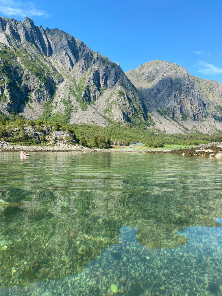 走著走著,天氣真的太熱了,我們決定找一個海灘下水游泳。北挪威的海水都非常的清澈,但也非常的冷,前兩次去羅弗敦群島我只有把腳泡在水裡一下就冰的要命。不過這幾天溫度都很高,這邊也稍微南邊一點,海水應該也被曬熱了吧?