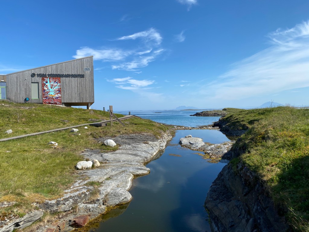 第二天起床之後,在旅館吃完自己做的早餐,我們就開車到Vega的世界遺產中心Verdensarvsenter去參觀。世界遺產中心建在北邊的海岸邊,是一棟很有北歐風格的木造建築,裡面有小小的展區,一個可以一覽海岸線的咖啡館,還鋪了木頭棧道讓大家可以在海邊散步。