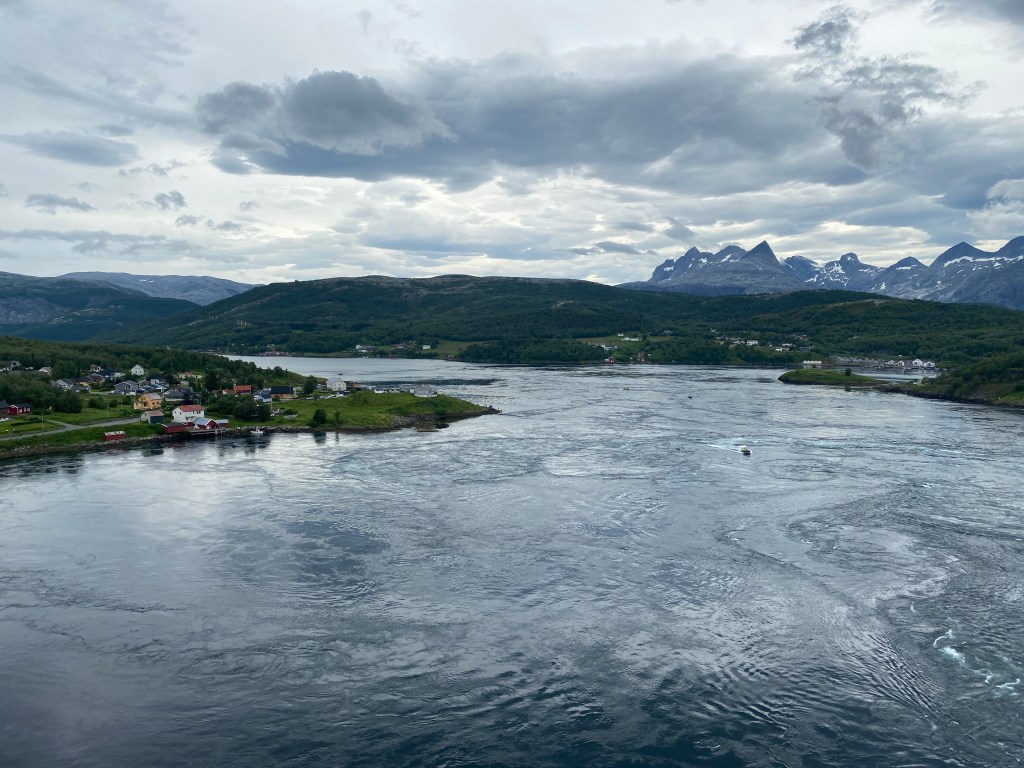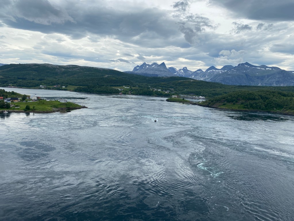 這天我的飛機是下午兩點五十分,這個地方離機場大概是55公里,一個小時內會到,沒有渡輪,完全就是公路,比較不會有要等待的意外。去機場的路上會經過挪威最大的冰河區,半小時左右會到一個洋流區,每六個小時會出現一次很大的海洋漩渦,像是大海中的按摩浴缸。