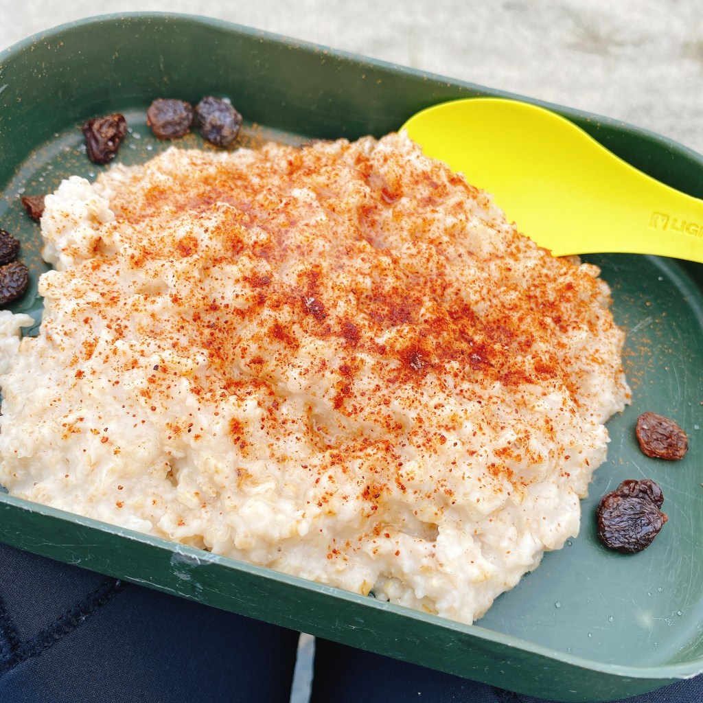 回到帳篷之後,姊姊剛好起來,我們就開始準備早餐。早餐是第一天在超市裡面就先買好的東西,挪威傳統的燕麥粥,可以撒上肉桂粉跟砂糖,加入葡萄乾,就是一個甜的早餐。在比較豐富的飯店早餐裡會有這樣的選擇,但我從來沒有自己做過。這也是一個露營時很方便的食物,需要的食材只有燕麥跟水。