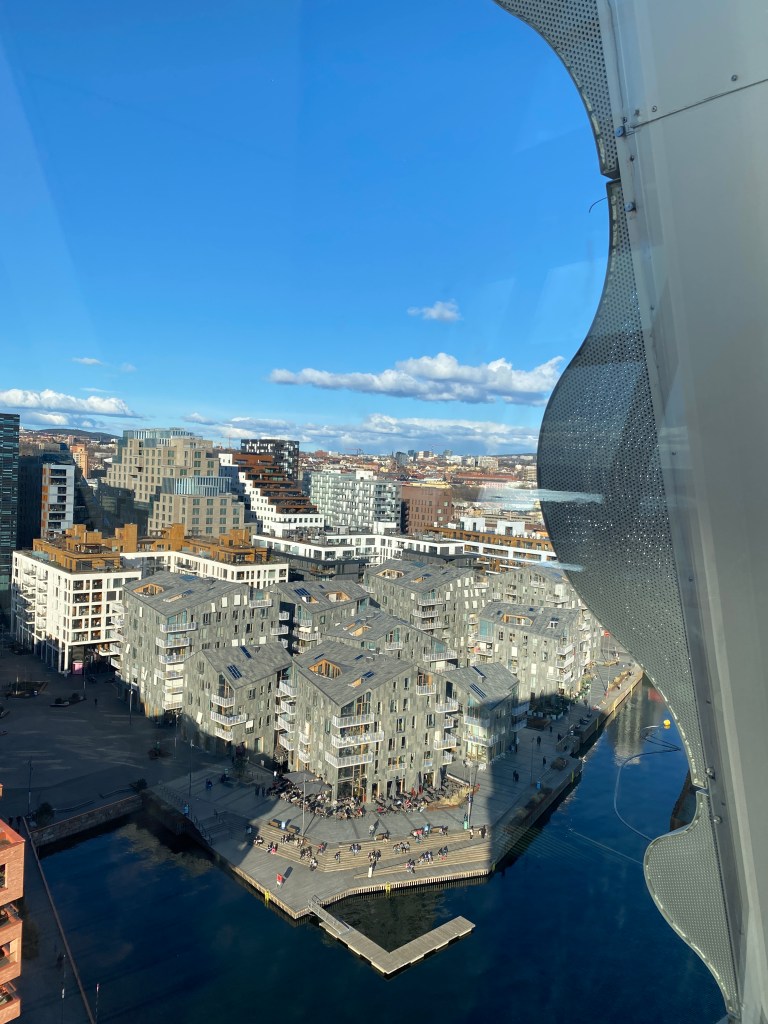 十二樓餐廳外的觀景台非常的棒,奧斯陸峽灣的景色盡收眼底,另一邊還有奧斯陸的一排高樓大廈Barcode,以及新開發的海邊住宅區,所有的景色搭配上今天的藍天白雲真的太棒了。十三樓有一個skybar,跟餐廳一樣今天都沒有開,下一次想要來坐下喝個咖啡、吃個飯、或喝個雞尾酒。