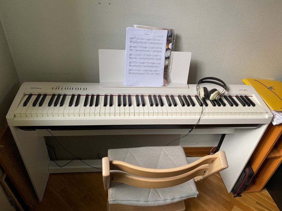 決定要開始重新上鋼琴課之後,就去買了一台Rodland的88鍵白色電子琴。原本在finn.no上面看到很多免費要送出的直立式鋼琴,載回家來調個音就可以用了。但鋼琴這種東西,一但進了家門要再出去就很困難,老鋼琴的保養也是一個可能的問題,再加上當時我也不知道這個想學琴的念頭會持續多久,畢竟我就是一個虎頭蛇尾的大戶。電子琴不佔空間又方便,還能夠帶著耳機練習,到現在我還覺得是很好的選擇。