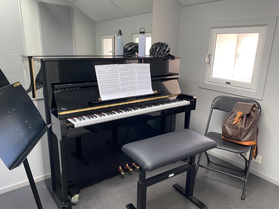 上課的地方叫做Øvingshotellet,直接的翻譯就是練習飯店。它的設計就像飯店一樣,每一層都有不同大小的房間,隔音設備做得很好,可以租借很多音樂器材,想要從事音樂活動的人們,可以租房間、練團、錄製唱片、練鋼琴、練聲樂等等的,旁邊就是流行音樂中心,佈告欄上也會有很多音樂相關的活動或是樂團的徵人廣告。租借的價格依據房間大小跟房間裡有的器材不同而有所分別,鋼琴是通常都是小小的一間,鋼琴教室就是在這裡上一對一的課程。