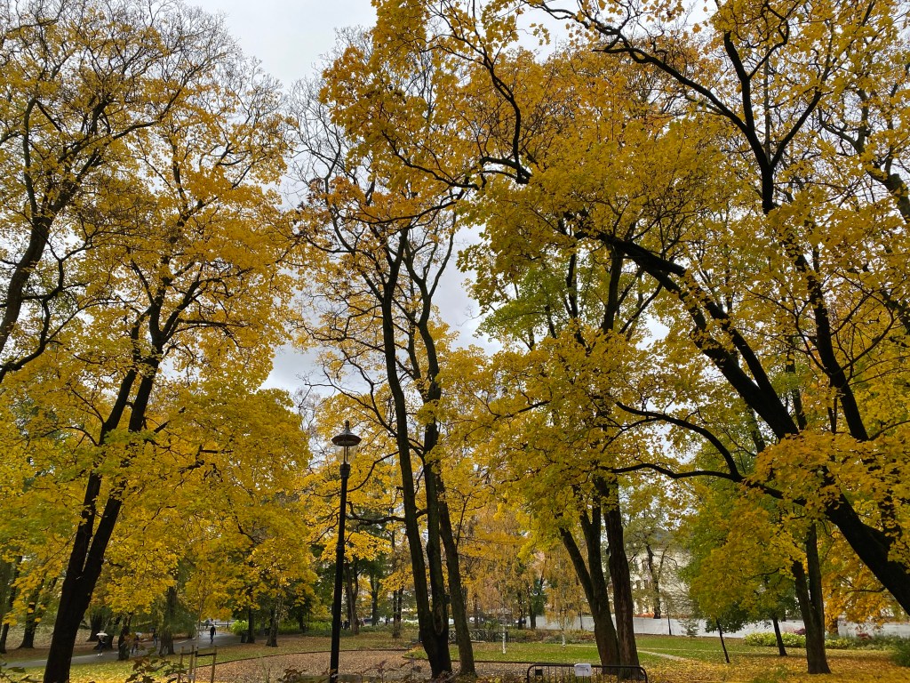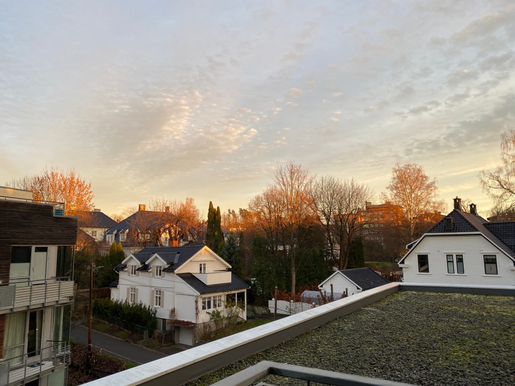 高緯度的奧斯陸是一個四季分明的地方,就像日本一樣。秋天一到,周圍的植物會完全換成另外一個顏色,爬壁的藤蔓植物會先變成很深的酒紅色,接著樺樹也會由綠轉黃,楓樹的大葉子也會變得黃澄澄,雖然沒有我們熟悉的銀杏跟紅葉,但這邊的秋天景色也是一樣的迷人。