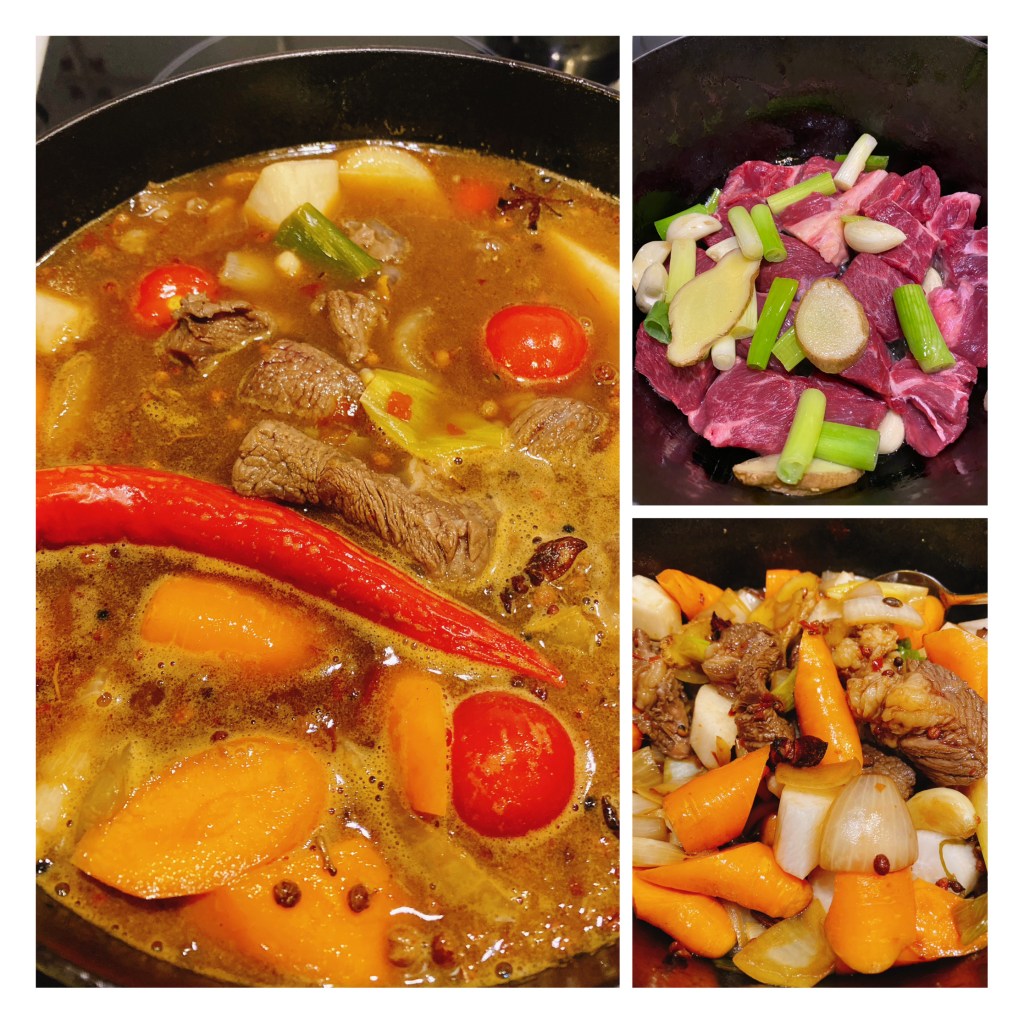 牛肉一塊塊擦乾,拿出鑄鐵鍋熱油,先爆香薑片、蒜頭跟蔥段,接著煎牛肉,肉都上色之後推到旁邊,把洋蔥入鍋炒到透明,就可以加進醬油、豆瓣醬、冰糖、花椒跟八角拌炒,在這個階段我還加進了白蘿蔔跟紅蘿蔔,因為滷起來會非常好吃,最後放進一些番茄跟一根辣椒,加水蓋過食材,一邊滾一邊清理浮沫,這個階段最花時間,但重複的動作令人心情平靜。