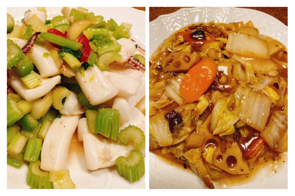 這兩鍋都弄好之後,就開始準備今天真正的晚餐。冰箱裡還有昨天剩下一點點的蓮藕、日本菇跟半顆白菜,打算把這一些一起煮一個加料版的醋溜白菜。芹菜炒透抽只要嗆米酒進去,不到十分鐘就可以上桌,半公斤的透抽太多了,於是留了一半打算明天來做韓式海鮮煎餅。