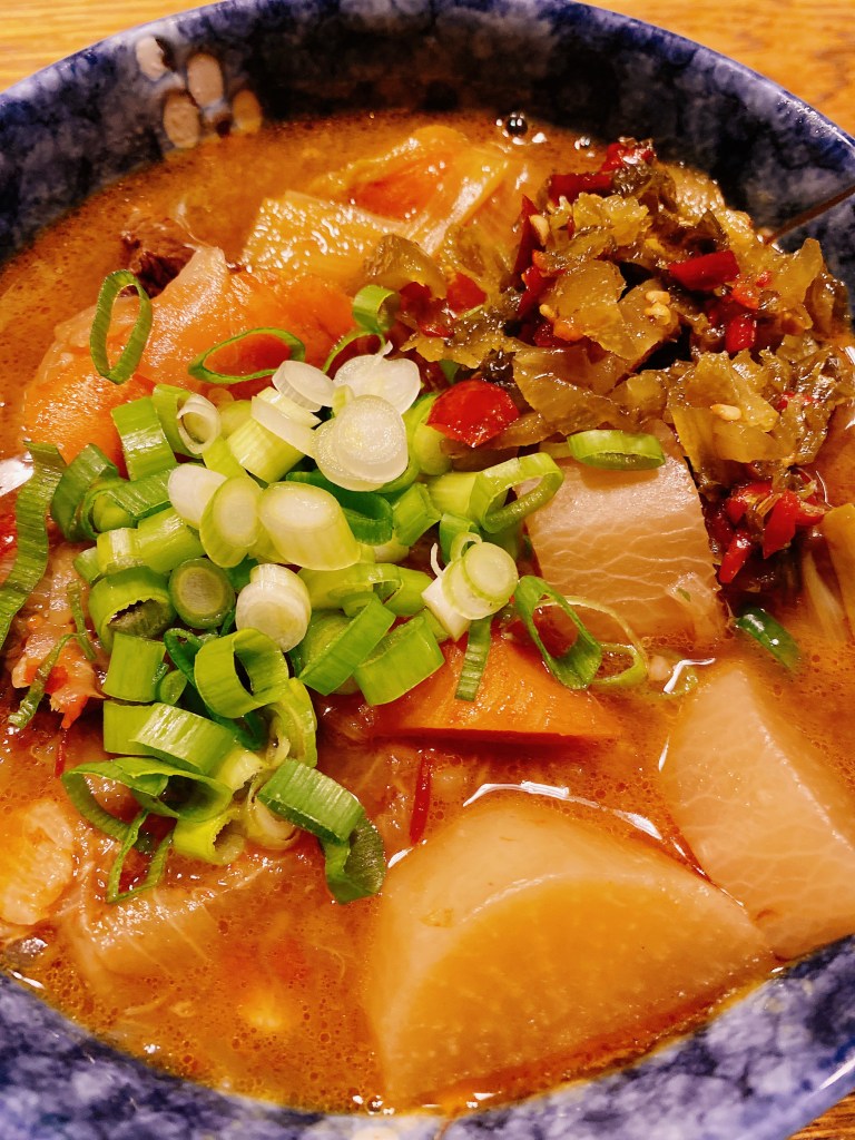 週六的晚餐用前一天燉好的牛肉做了牛肉麵。用了之前在亞洲超市買的手打烏龍麵,淋上了牛肉湯,裡面的紅蘿蔔跟大根燉的非常入味,加上酸菜辣椒,吃了一碗很適合這種陰雨天的紅燒牛肉麵。