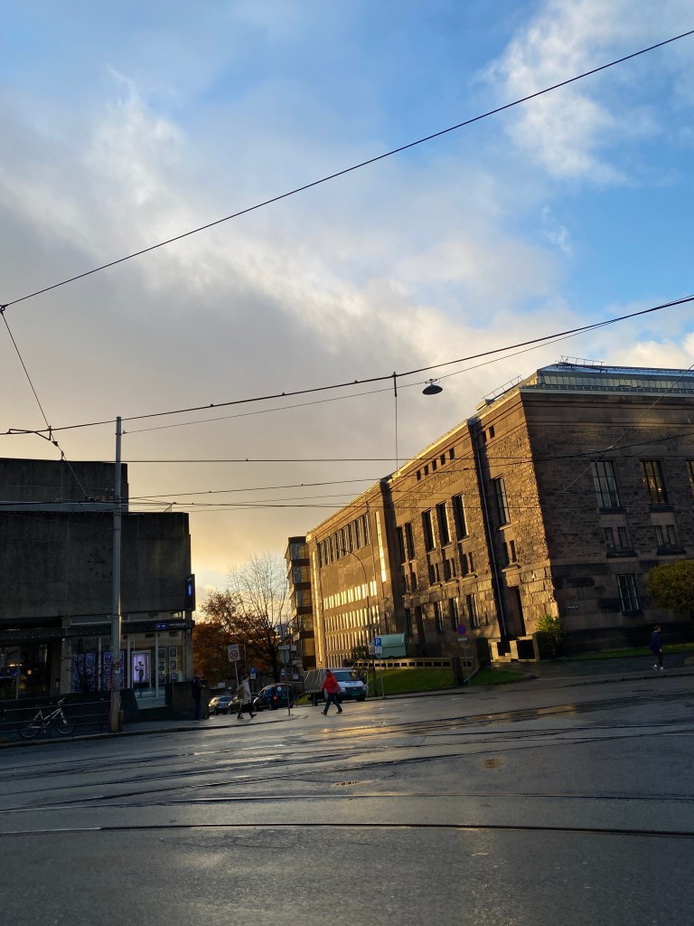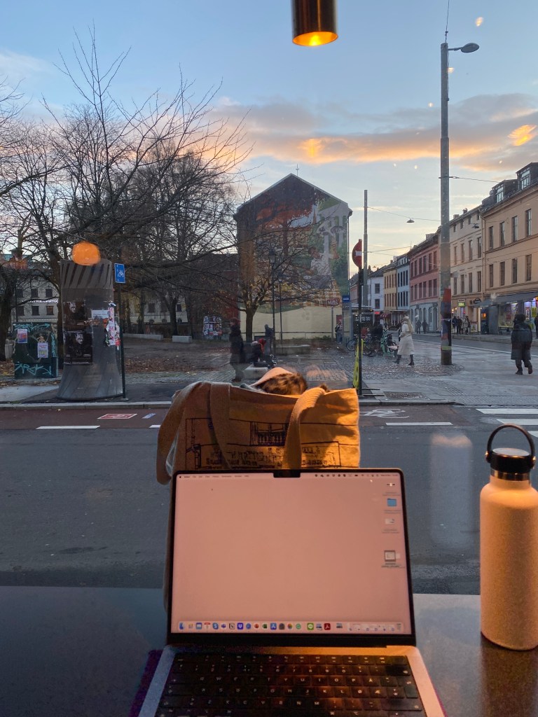 最後我只好移到角落的沙發位子。它在電車線的旁邊,遠遠的看得到廣場跟旁邊的街道,不過天空就只有一小角,上課的一個半小時前在這邊泡一下咖啡店非常的舒服。