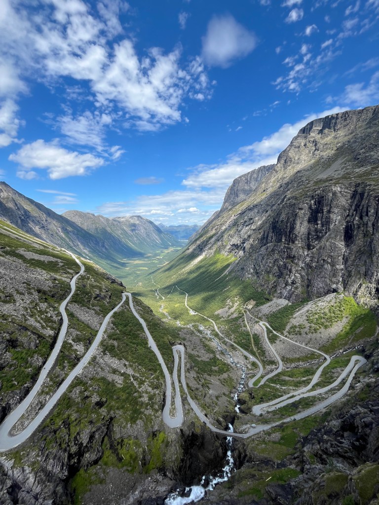延綿不絕的山脈有冰河留下來的U型河谷,人工開鑿的車道千折百轉,往更遠看去可以看到Åndalsnes小鎮,兩邊高聳的山壁很有氣勢包圍著我們,配上藍天白雲跟陽光,真的只能打從心裡發出哇的讚歎之聲。