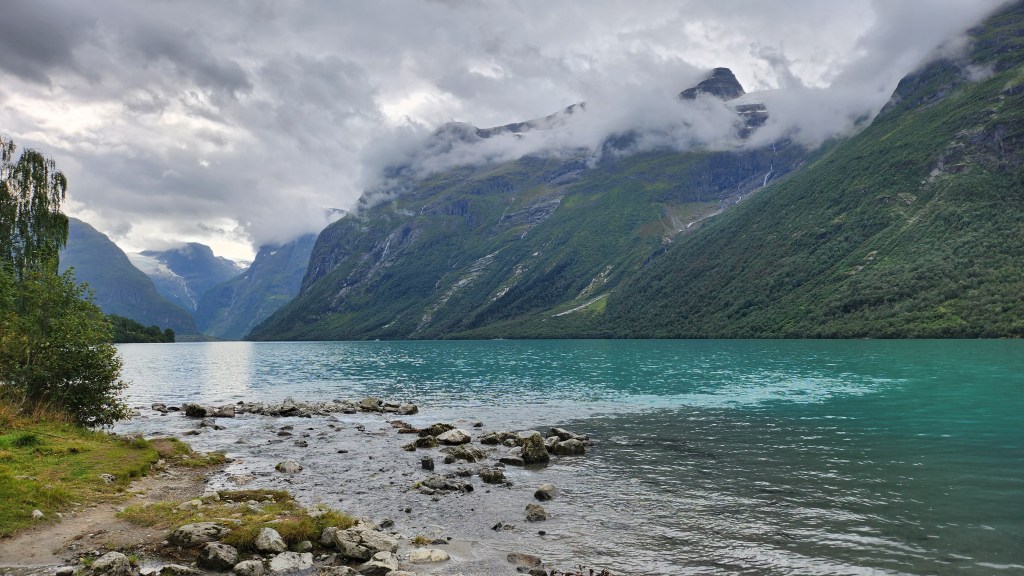 吃完蠻晚的早餐我們就打包好準備出發,太陽還是躲在雲後面沒有出來見人,小鎮的天空也有一層薄薄的霧,這樣的天氣不利於登高望遠,於是我們只好放棄纜車,決定開車過去小鎮得名的湖邊繞一繞。這個地方已經很接近國家冰河公園了,遠遠的山上都可以看見冰河窩在山腰上,Loen湖也是一個有名的景點,十分漂亮。