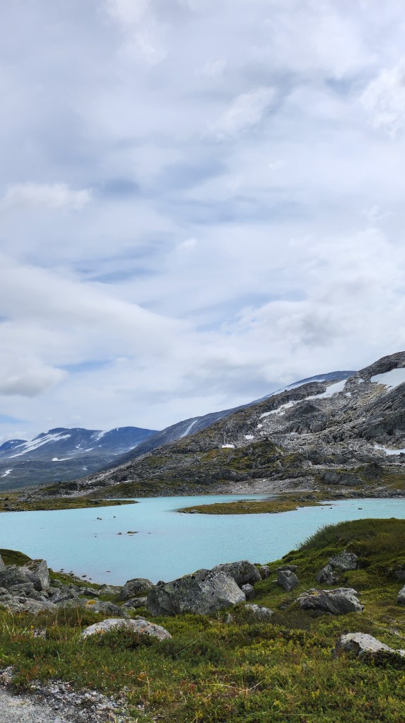 停車場有兩台露營車正在收帳,河邊還有一頂帳篷,挪威人們穿著毛衣,拿著馬克杯坐在湖邊的小木桌上野餐,空氣稍微有點涼意,那樣的綠色很難在其他地方看見,這個湖未免也太美了吧。