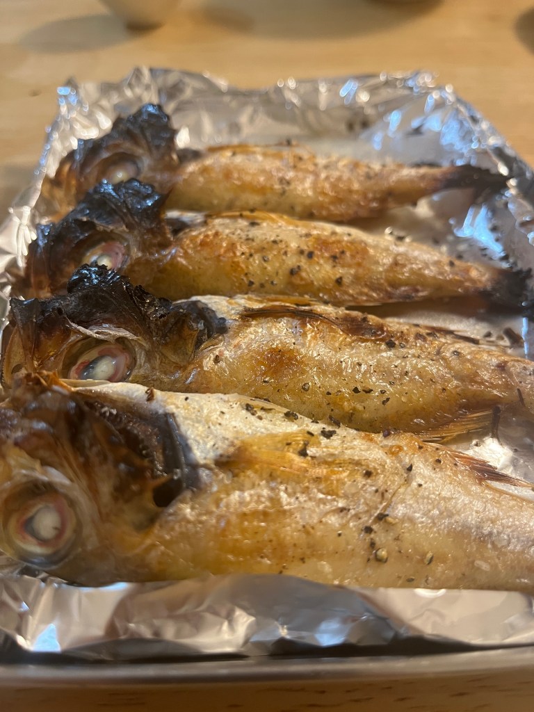 回家之後我就開始準備晚餐,挪威先生上樓去寫作業跟複習。我一邊看浪漫的匿名者一邊煮飯,用氣炸鍋烤了跟居酒屋一樣的山藥,炒了小松菜跟韭菜,再加上烤魚,簡單的晚餐就完成了。