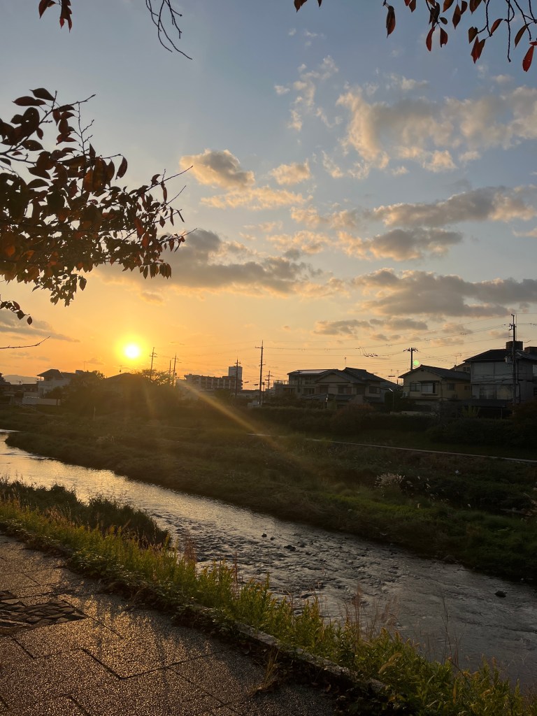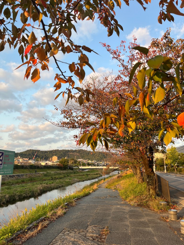 秋天的鴨川還沒有到絕景,不過已經有各種顏色的樹葉了,襯著陽光非常的美。早上騎車上學的時後已經拍了一個白鷺鷥開朝會的照片,接近四點的天空太陽已經慢慢西下,光線加上清澈的河水,配上涼涼的風,是非常棒的河邊休息時間。