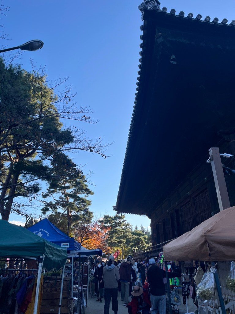 走著走著百萬遍就到了。一到市集我們就想要找吃的,市集比我想像中大很多,攤位也很密集,我們從正門進去,一進去就被賣酒粕的攤位吸引,老伯伯挖了一勺給我試吃,味道非常的棒,他說這個是純米吟釀剩下的酒粕,跟超市賣的完全不一樣。接著挖一勺超市的月桂冠酒粕,吃下去完全沒有味道,我馬上就掏出了五百日圓買了一包。