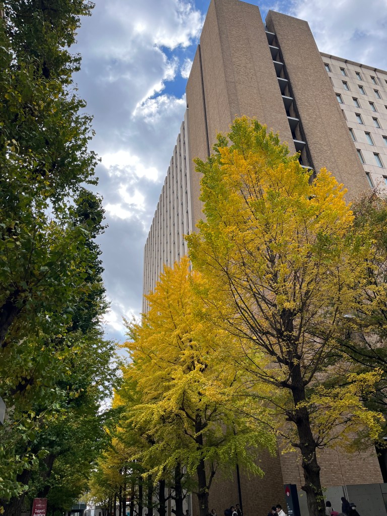 往皇居方向過去的廣場兩旁都種著銀杏樹,有些已經黃透了,有些還綠黃參半,像這種長在同一個地方的樹們,為什麼也會有不同的黃葉時間呢?旁邊的丸之內購物中心已經把聖誕節燈飾都裝上去了,在路中間也有一些聖誕市集,賣很多漂亮的聖誕節裝飾,才十一月中大家就等不及要過聖誕節了。