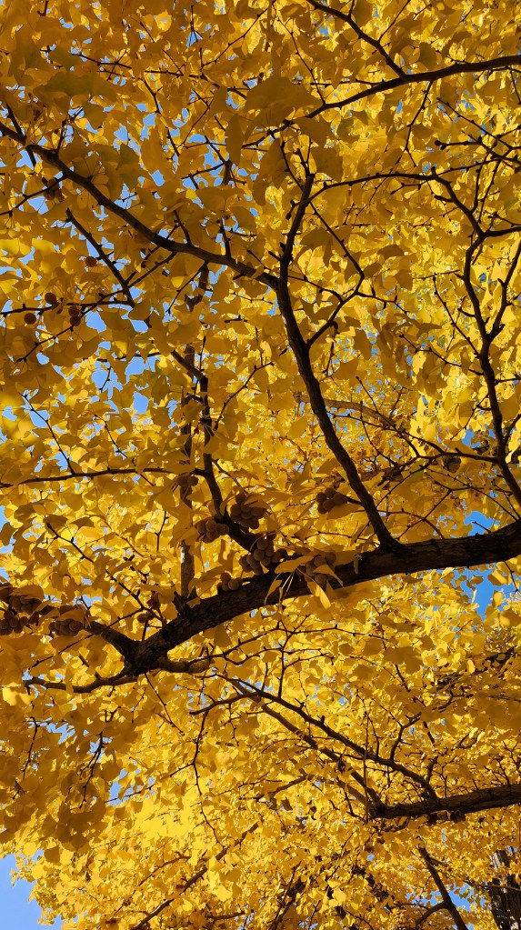 黃澄澄的銀杏在藍天陽光之下真的太美了。那種顏色感覺會刺到眼睛,世界上竟然有這麼飽和的黃色,尤其是在三星手機裡的顏色對比非常明顯。銀杏隧道有些地方真的非常的臭,畢竟銀杏就是以有點臭聞名,在一些樹上還看到了結果的銀杏,一顆顆的黏在樹幹上的感覺,原來銀杏是這樣長在樹上的。