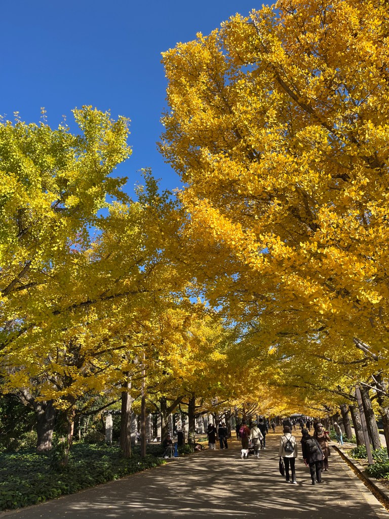 銀杏並木隧道這邊的樹就是自然的伸展,比神宮外苑寬敞許多,雖然也是蠻多人,但非常舒適,也很容易拍到空景。今天有很多帶著狗狗來散步的人,我們兩個走在隧道裡面,也跟好幾隻狗打了招呼玩了一下。