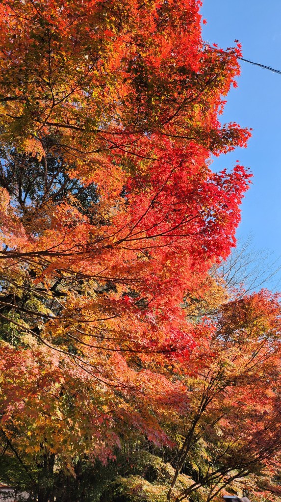 三連休的最後一天公車非常、非常的擠。這是我們第一次坐到擠成這樣的公車,三千院畢竟是賞楓名地,這麼多人也是應該的。越開越往山上去,風景也越來愈美,經過八瀨口的時候,那邊的楓葉紅的很美,是時候來去搭一下晚上的叡山電鐵了。