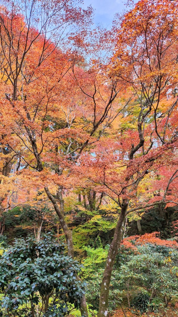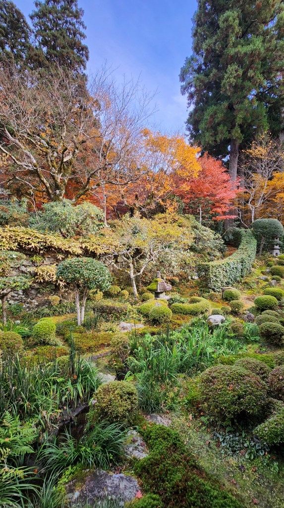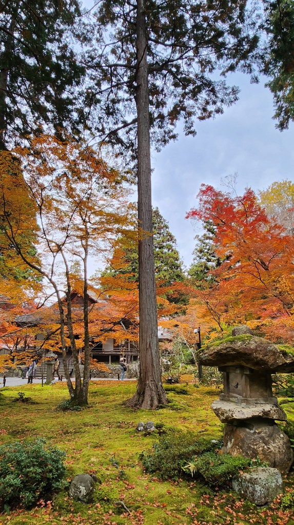 三千院的庭院非常的美。這邊的楓葉大概紅了八成,偶爾還是會有一棵楓樹上有三種顏色的楓況,比起紅葉來說,我覺的更像是橘葉,可能品種不大一樣。落在苔蘚上的楓葉是乾枯捲曲的暗紅色,秋天真的太美了,可以看到各種大自然調出來的各種色差。