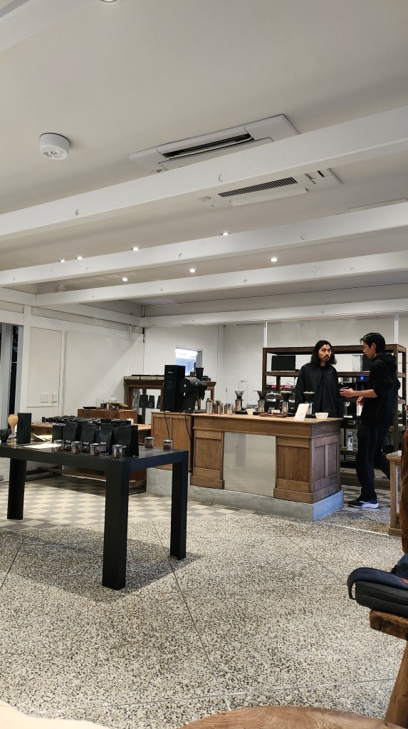 不過都已經進來了,我們就跟咖啡師聊了一下天,聽了他的建議,我點了盧安達跟哥倫比亞的混合豆,是他們的咖啡裡面苦味最濃的,挪威先生點了巴拿馬藝妓跟衣索比亞的混合豆,空間非常的極簡,在等待的同時很多人進來看了一下又走出去,老實說我們花了快三千日幣喝兩杯咖啡我也覺得有點誇張。