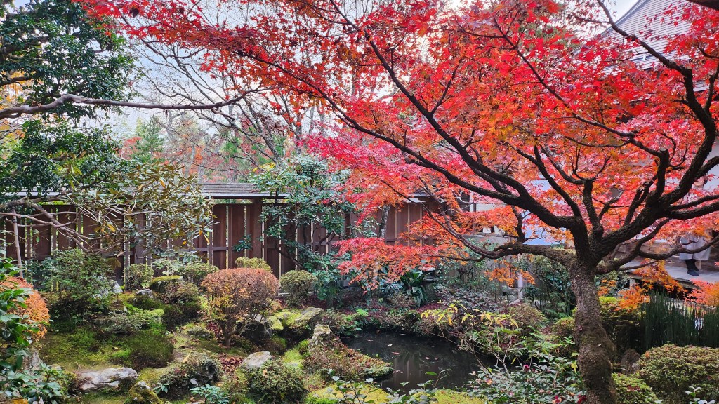 這裡非常小但的確是蠻美的。庭院設計的很美,喝抹茶的簷廊一邊對著很大顆的楓樹,一邊對著七百年的五重松,人不能算多,還有有地爐的小房間,是一個小而美的庭院。