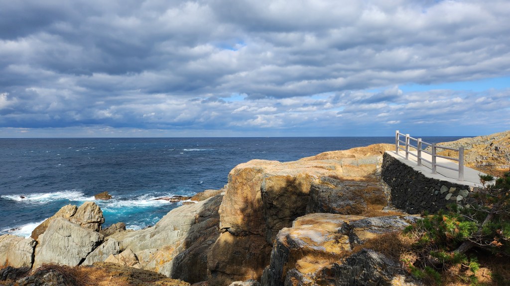 走上燈塔要爬一百六十三階旋轉樓梯,而且要脫下鞋子,只能穿襪子爬。雖然稍微有一點辛苦,但在天氣超好的今天爬上燈塔頂,可以看到好遠的地方跟很美的風景。日本海的海風非常猛烈,還好我有戴帽子出門,這就是我的日本海初體驗。