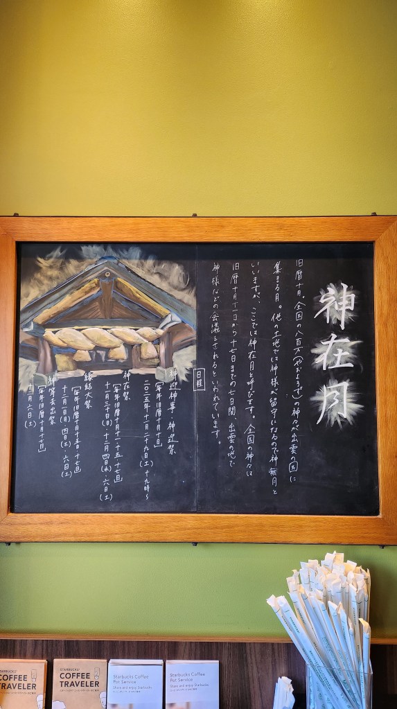 離祭典開始還有一段時間,我們就去大社外面的星巴克在喝一杯咖啡。走來走去又進進出出暖氣房我覺得好熱,就點了冰拿鐵。等咖啡的時候發現星巴克的黑板好漂亮,在這邊上班的人難道要先考美術才能進來嗎?
