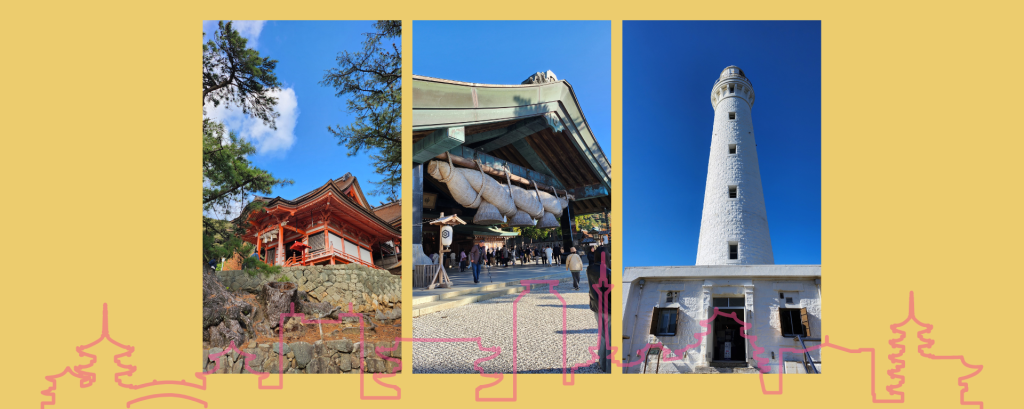 往日御崎的公車路線非常的美,日本海在晴天下超美,海水有不同顏色的藍,配上海岸線跟山路,令人覺得心情很開闊。搭了一下子就經過迎神的稻佐之濱,在岸邊的石頭上有小鳥居跟神社,非常的可愛。