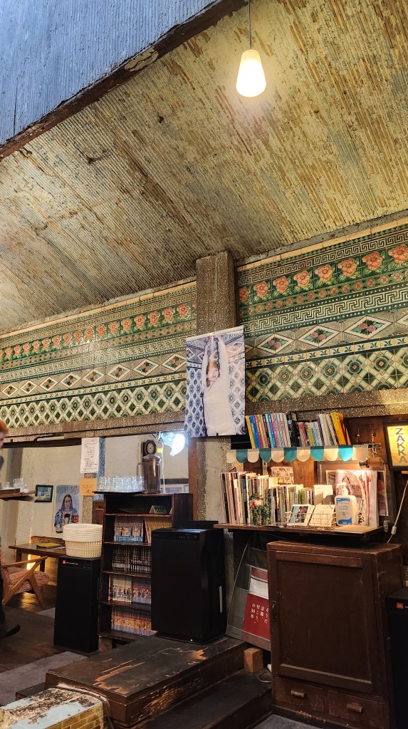 室內保留著很有味道的花磁磚,要說很花其時她很花,書架上有很多漫畫跟書可以拿來看,牆上還掛著綾瀨遙在這邊拍的海報。接近地板的地方還留著當時錢湯的出水口,每個位置的沙發椅都不一樣,整體來說是非常可愛的咖啡店。