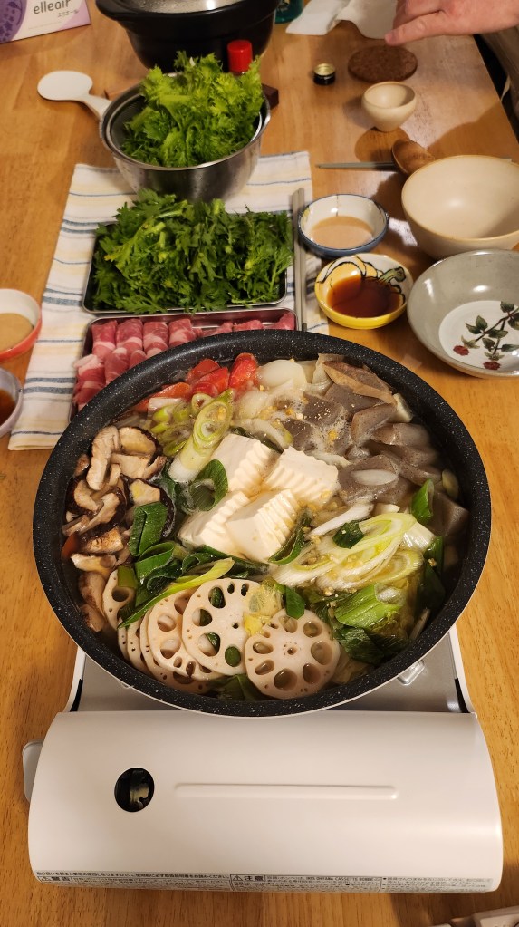 先在瓦斯爐上把湯底跟蔬菜都煮軟之後,拿到桌上來加熱,豬肉片涮好之後,沾著芝麻醬真的是人間美味,冬天真的好適合吃熱熱的食物,而且可以一邊煮一邊吃一邊聊天,火鍋真的很棒又能吃到很多蔬菜。