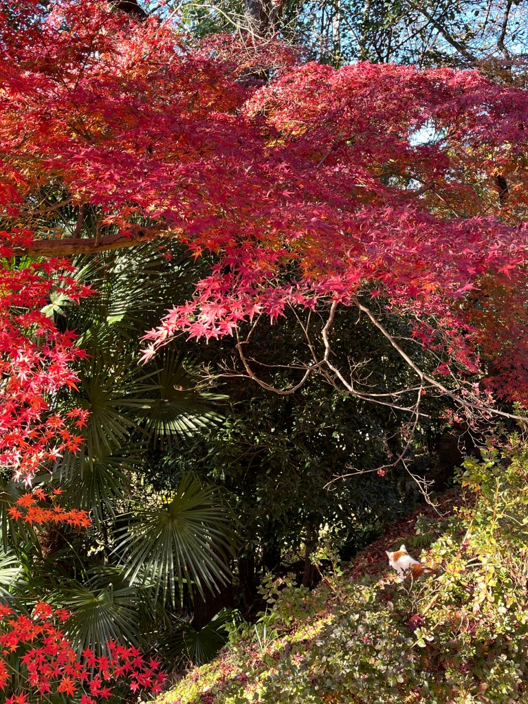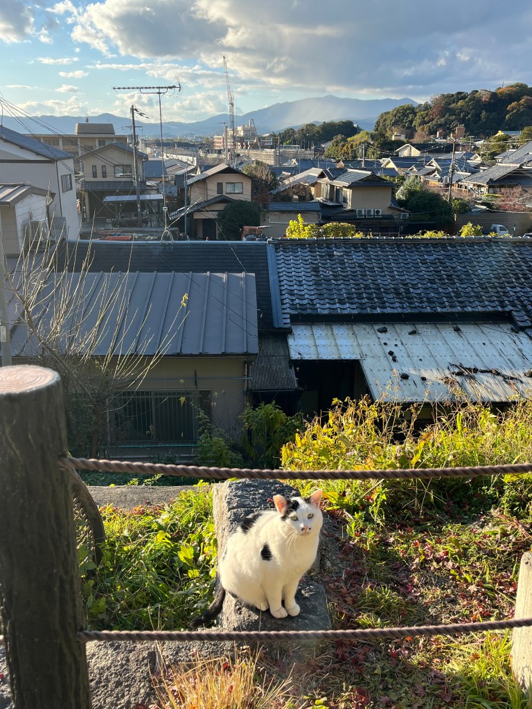 哲學之道在秋天的尾聲安靜許多,還是有三三兩兩的遊客,比起之前來的時候好騎很多。到了貓咪們所在的區域,有一對老夫妻在那邊,帶著貓食在喂貓。我跟每次來的時候都有擼到的白色跟橘色貓咪打招呼,他從欄杆外跳進來裡面。然後老婆婆就開始站在我跟貓的中間,一直叫貓下去下去,非常的奇怪。