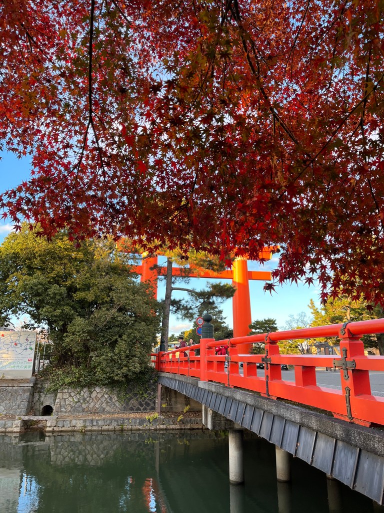 南禪寺到平安神宮這一條路很美,會經過琵琶湖疏水道,不管是走路或是騎腳踏車,都會在水邊,風景很美。要轉進美術館之前,平安神宮的大鳥居剛好被陽光照著,搭配著水道旁邊正紅的楓葉,非常的美。