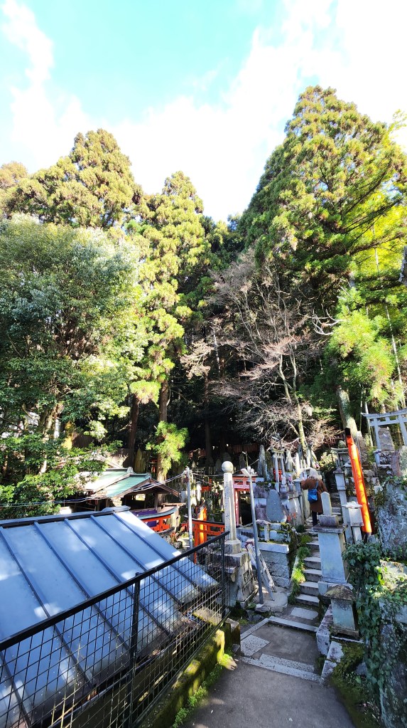 一路上都非常小的羊腸小徑,往上走的路上也有好幾個這種神社集合地,也有很多非常小的流水瀑布,雖然沒有千本鳥居,但風景的確蠻不錯的,路邊的樹跟野花也很多,京都市還會在路上標示這邊可以觀察到的植物跟生物,還有各種森林是大家的不要生火跟丟垃圾之類的標示。