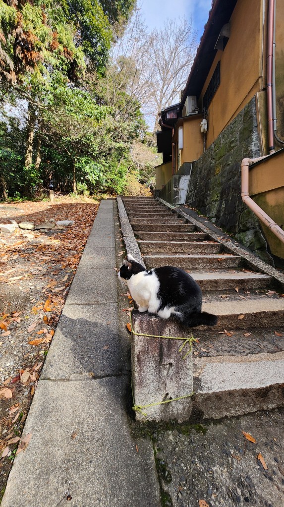 下山我們就沿著鳥居走下去了,中間也有很多小神社跟賣店的休息站,走到接近本殿的時候,遇到了兩隻很習慣人的貓,第一隻一開始在用樹幹當作貓抓板,一邊抓一邊很認真的研究樹上的小鳥,可能在考慮要不要上去。放棄之後他走出來參道這邊,看起來就是很習慣有人在旁邊,我跟著他走了一陣子覺得有貓真的好棒。