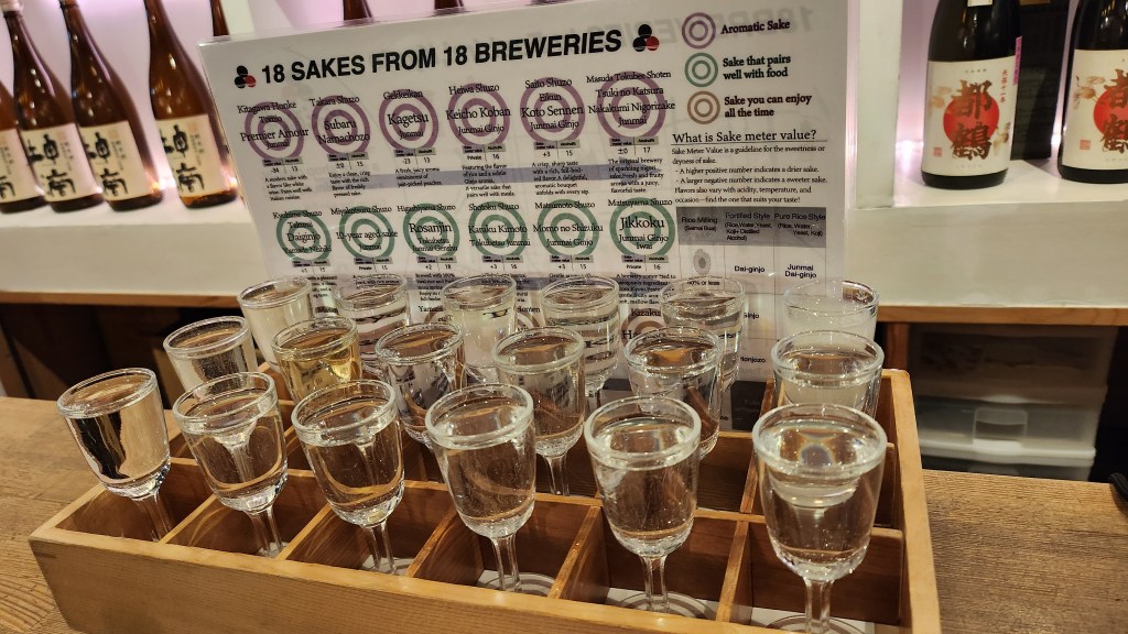 因為我們想要試十八種清酒,於是我們就在酒藏那一家坐下來了,十八家清酒聽起來很多,但是杯子很小,加起來其實就是清酒兩合。我們點了一份十八家酒藏清酒,加上一份冬天的新酒,姊姊沒有聽清楚點法,就點了一個柚子氣泡酒。