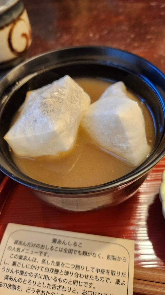 栗子烤麻糬其實就是烤麻糬放在栗子泥的濃湯裡面,因為栗子泥很甜,店家還附了紫蘇做的酸豆可以調和味道。一開始上了一杯烘培茶加上栗子紅豆羊羹一小塊也很好吃,我跟挪威先生點了黑咖啡,旁邊也付了一塊最中。麻糬配上栗子泥非常美味,加上紫蘇口感更特別,一份不到七百日幣非常划算。