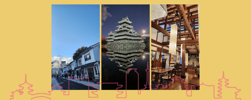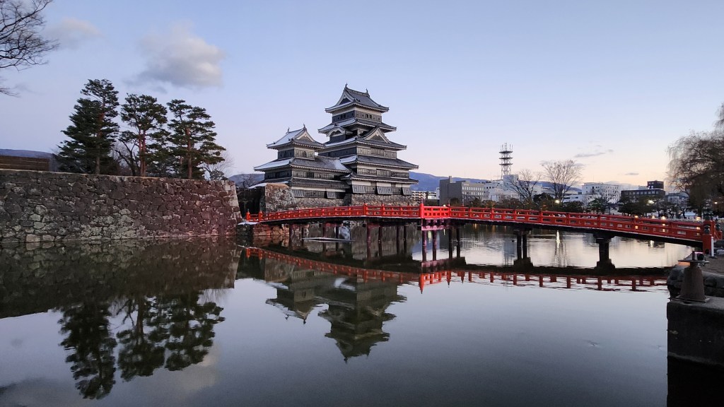 放好行李之後我們就出門去散步。天氣很好,松本比京都乾一點,一出飯店遠方的山線看得很清楚。Gemini告訴我松本的景點都是走路一小時的範圍可到達,也有循環巴士可以搭,不過我們挪威人的傳統就是要走路,於是我們就開始了城市走路散步之旅。