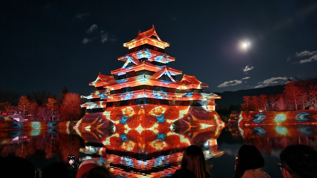六點投影秀開始,我們站在城的對角線觀看,總長度大概是八分鐘左右,配著澎湃的音樂,有三段投影的主題,投出來的影像非常清楚,圖像的設計也配合著松本城的外觀,變化的動作跟時間點都掌握得很棒,竟然是免費就可以看到,投影表演太精彩了。