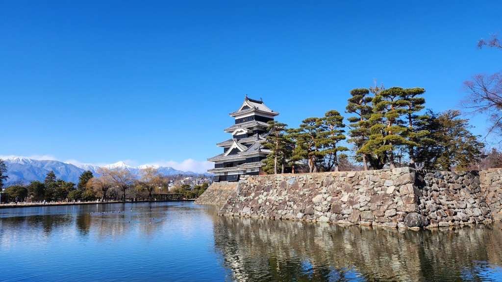 結果白天的松本城外面就令人留連忘返。這真的是目前我心中第一名的城,姬路城也很完整但我大約二十年前去的已經印象模糊,大阪城我只覺得裡面有電梯好奇怪,金澤城看起來像全新重建的模型,松本城不但結構很完整,護城河也很棒,後面還有很美的高山山脈,啊寫到這裡想到還有二條城,但皇城跟這種武士的城應該還是在不同的層次無法做比較的。