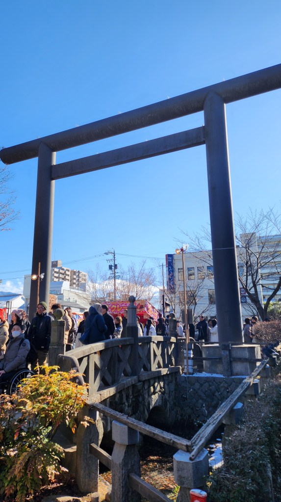 走到後面進去了松本神社。鳥居旁邊還有井水,松本有好多水井,都掛著日本名水一百,這邊的水似乎非常的棒,市政府也整理的很好,讓大家可以自由的取景水回家使用。松本神社是黑色為主的建築,主殿也非常的漂亮,境內還有幾顆非常高大被綁了柱連繩的古樹,小小的但氣氛非常好。