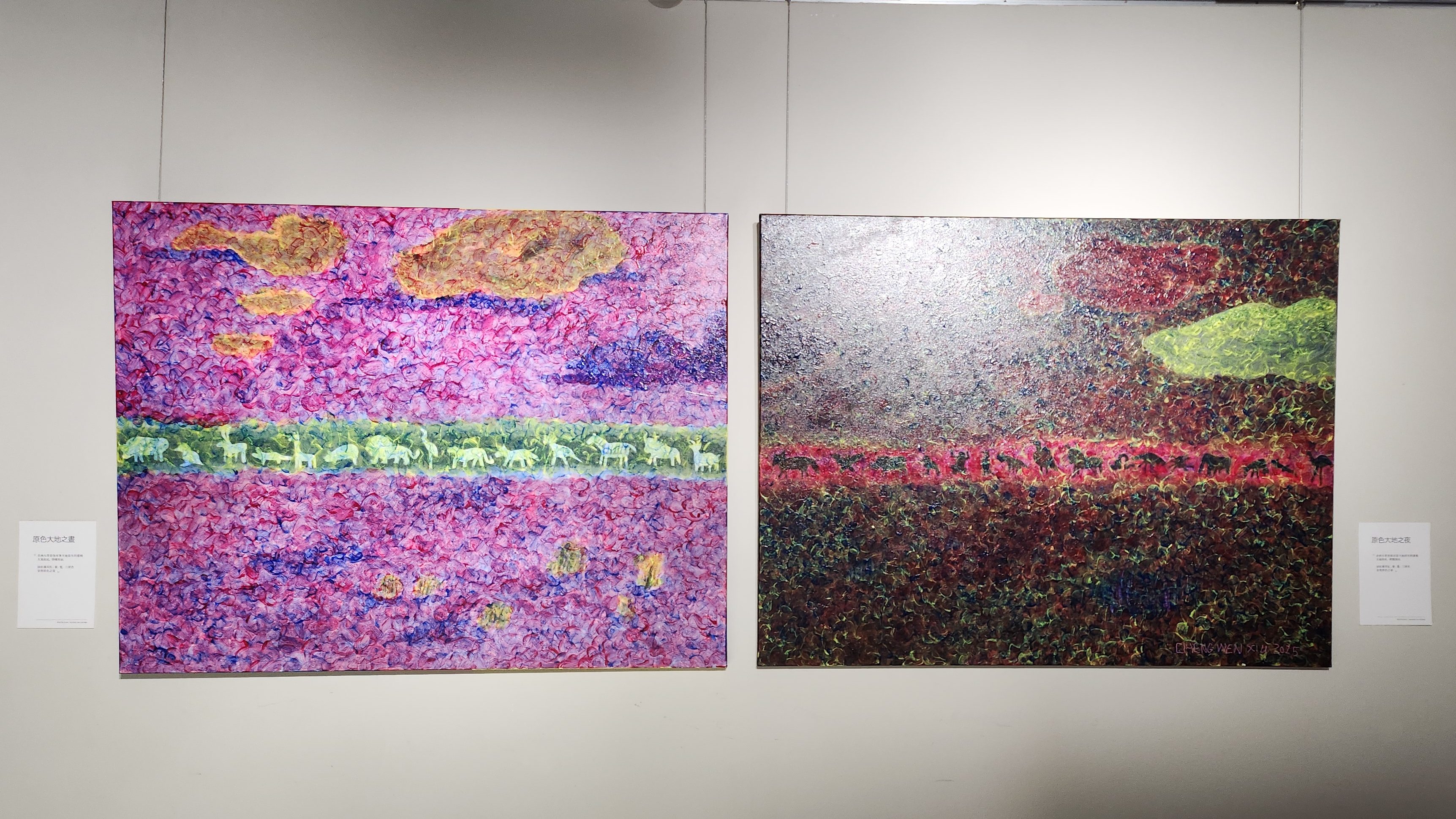 蛋白質奔向獅王這個系列是整體創作的開端。總是一起旅行的朋友們從非洲帶回了一個獅子的雕像,用肯亞的報紙包著送給了秀秀。她把它化成了一幅畫,大遷徙裡成群的牛羚要逃避獅子的追捕,但很笨的牛羚逃跑的姿態跟奔向獅子是一樣的道理,背離跟迎面而去是一樣的,可能很多人生的事情也是一樣,看起來好像在逃離,可是卻更加的拉近也說不定。