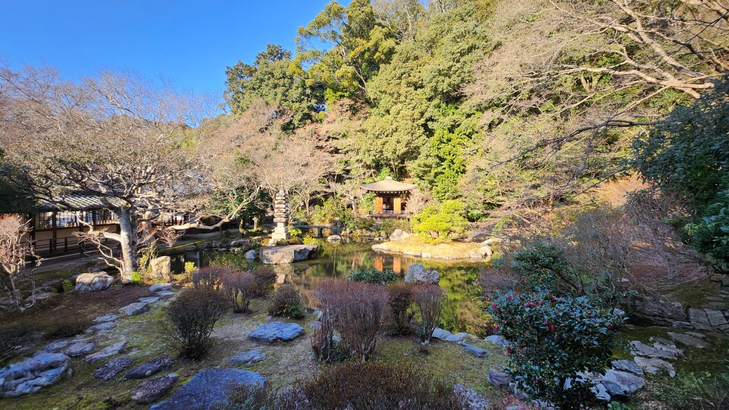 冬天是很安靜的季節,昆沙門堂遊客非常的少,整個寺院很安靜,這也是淡季的好處,沒有萬頭鑽動的吵雜。我們付了拜觀費進去參觀裡面所有的房間,因為要保護房間裡面的畫,一個一個的房間都是關著門的。這裡很多壁畫都是用遠近技法,在房間裡面都會解說怎麼樣看怎麼樣走會覺得畫有在動,我跟著說明那樣做,都沒有感覺到畫在動,我想我單純的就是沒有慧根。