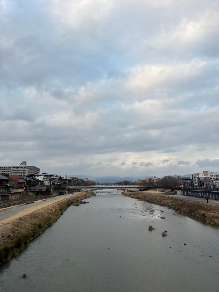 今天騎了腳踏車上學,經過御池大橋往北邊看過去的風景真的讓人百看不厭。每天都在大雪特報的日本,京都市區其實根本積不了什麼雪,而且這幾天天氣都還蠻好的,冷歸冷但還是有陽光跟藍天。不過比叡山那邊應該是積了很多雪,山頭都是白白的,山疊著山,遠遠看就是一副水墨畫,每次我都會停在橋中間拍一張照。