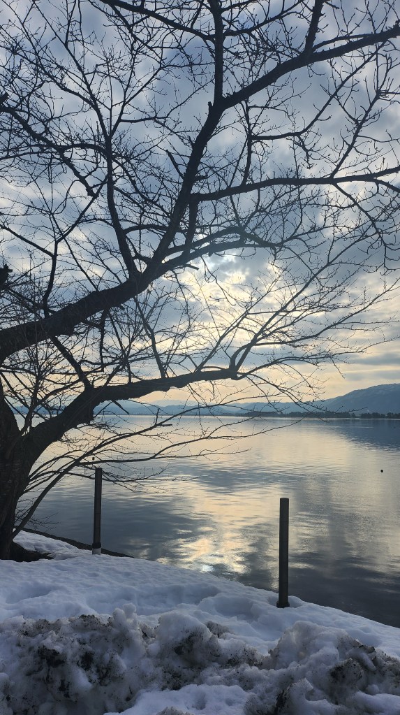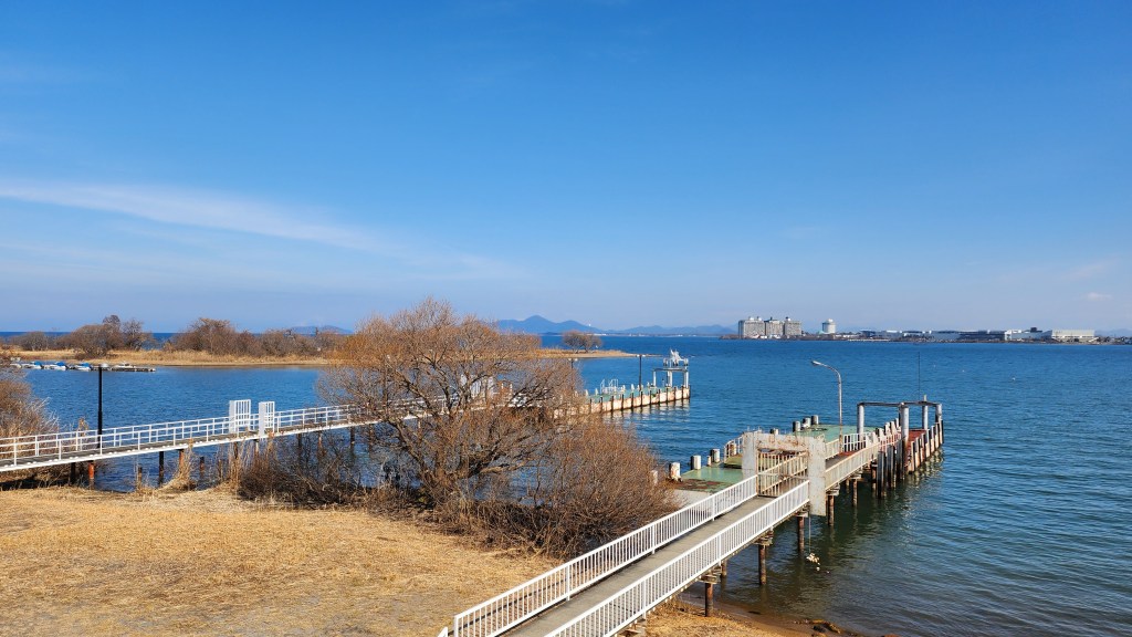 在這邊待了一陣子之後,有點不知道接著要去哪裡,附近的景點好像也沒什麼,我們就先定了一個隨便的位置往前開,想要沿著湖開看一下湖的風景。春天這邊應該會很美,沿著湖有很多櫻花的景點被標示出來,最後我們開到了湖北的海津大崎,在幾乎沒有車的沿湖小路開了一陣子,這裡更像挪威,湖岸邊都是雪,太好笑了。
