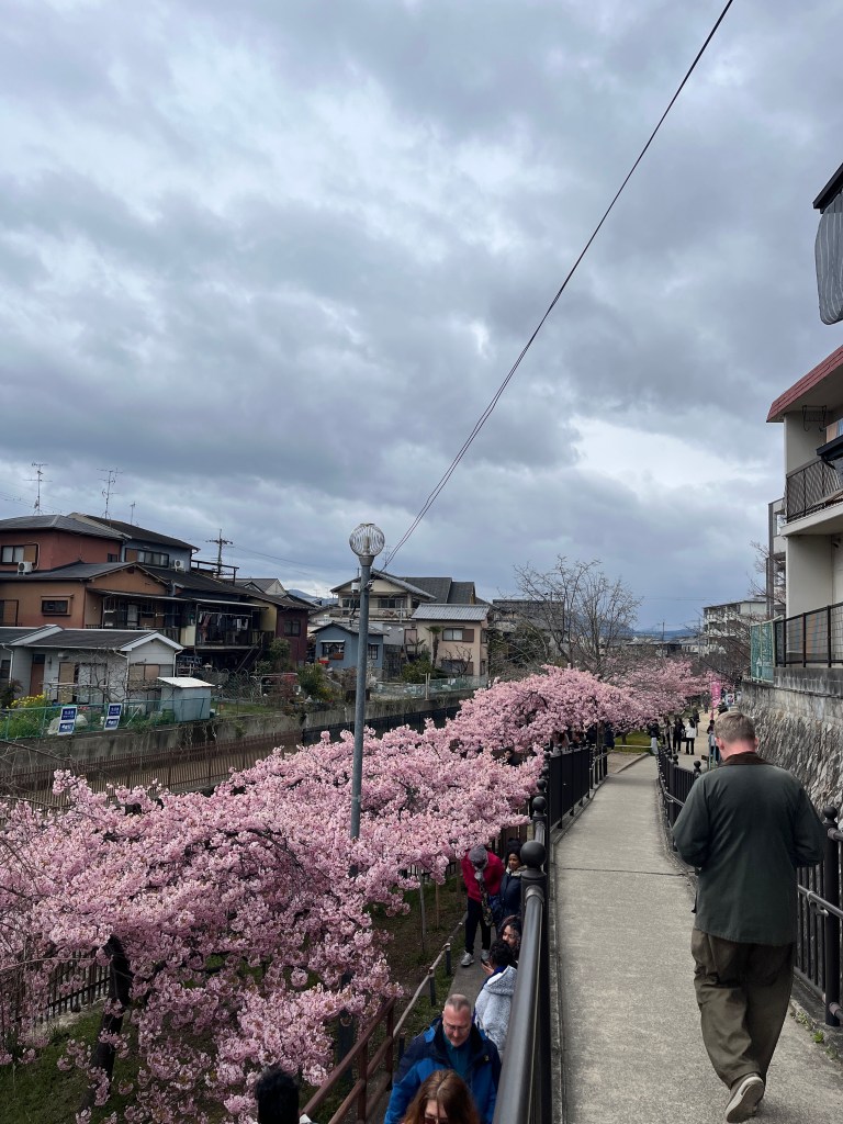 河津櫻真的是滿開中的滿開,有一兩棵樹已經開始出現少少的綠葉了。整個河岸都是滿開的粉紅色櫻花,很有春天的氣氛,但是今天的京都卻是寒冷的冬天啊,風很強很冷,剛剛從每天大概都十五度左右的地方回到八度的京都,我們兩個都縮著脖子在看櫻花。這麼冷的天氣下看櫻花還是第一次啊。