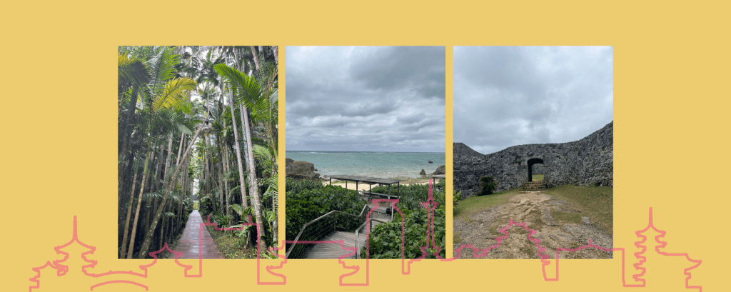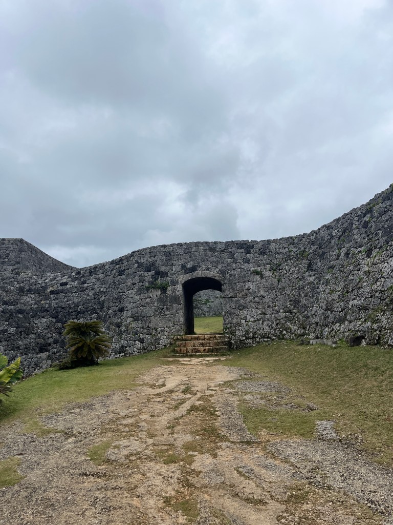 稍微有一點失望之後,我們就往座喜城遺跡移動。沖繩本島上面有非常多座城的遺跡,座喜城址剩下城牆,不過還是可以看出這座城當初的規模,介紹上面寫著是由製作城的專家建造的,原來以前還有做城的專門家。